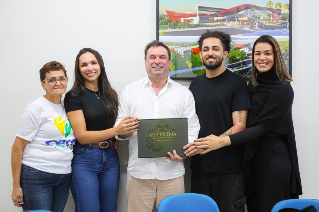 Os formandos João Pedro e Thaís Miranda representaram a Comissão de Formatura e aproveitaram o momento para entregar o convite para a colação de grau. A solenidade de formação de 28 novos médicos e médicas acontecerá no próximo dia 16 de julho, no salão do espaço HD Hall, no bairro Senador Arnon de Mello.