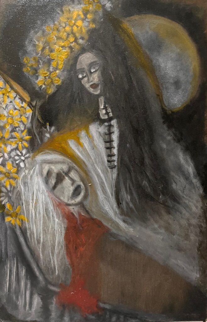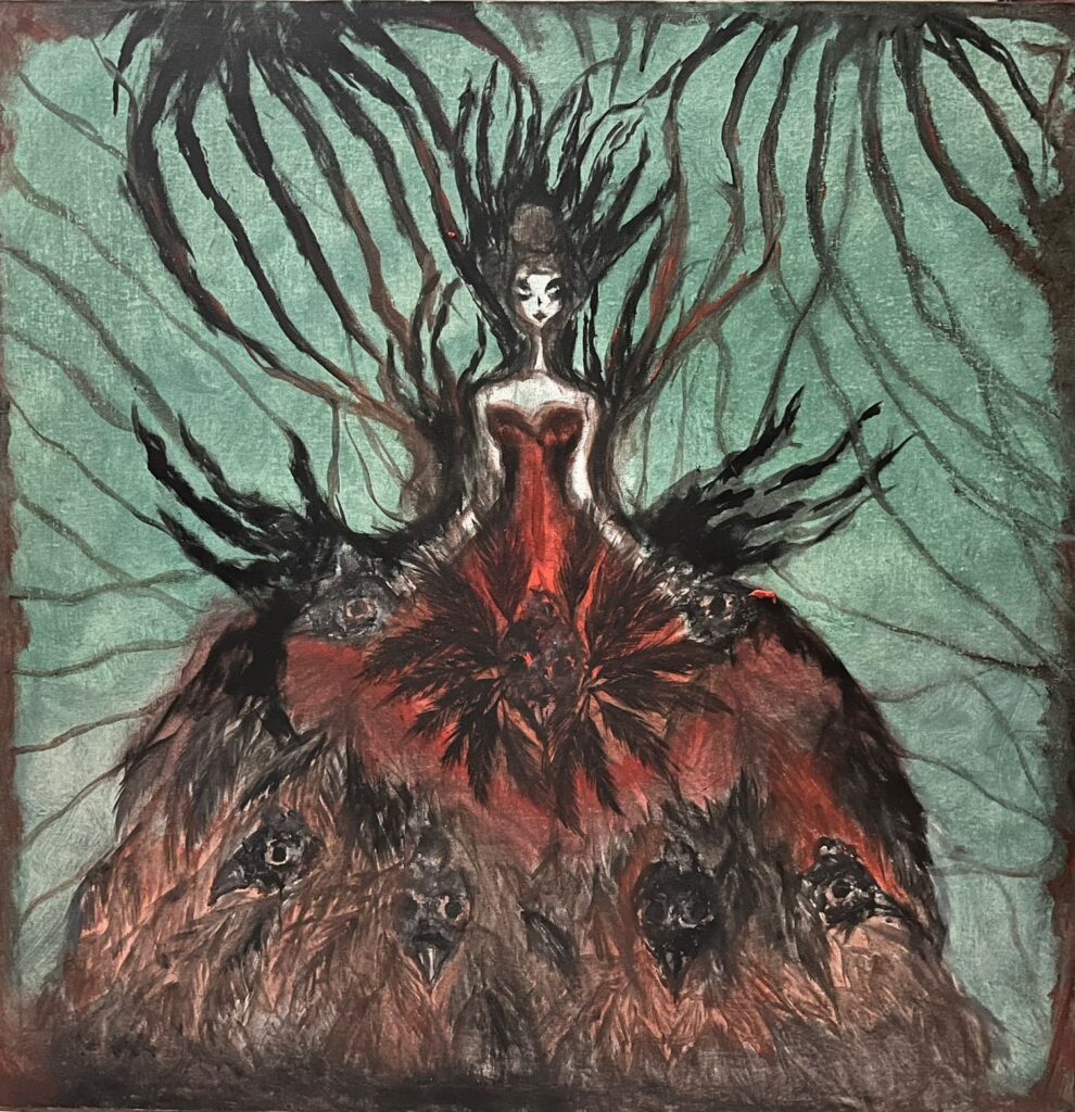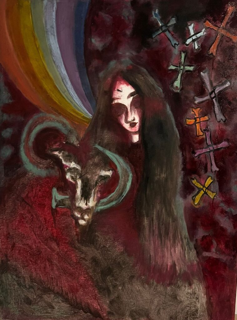 “‘Conjure’ é um convite ao invisível, ao simbólico e ao que existe além do que os olhos podem ver. Cada obra desta exposição nasceu do meu desejo de explorar o folk horror de uma forma íntima e espiritual, evocando práticas ancestrais e a força dos rituais de proteção e cura. Trabalhar com a pintura a óleo me permitiu criar transições suaves e uma profundidade que dialoga com essa temática sobrenatural, como se cada tela fosse um encantamento visual. Cada uma dessas nove pinturas nasceu de um mergulho profundo em temas do folk horror e do sobrenatural, mas sempre com um olhar simbólico e surreal. Usei a pintura a óleo porque ela me permite trabalhar com calma, criar camadas, sobreposições e transições suaves, o que dá uma sensação de movimento e profundidade, quase como se cada obra tivesse vida própria”, apontou a artista.