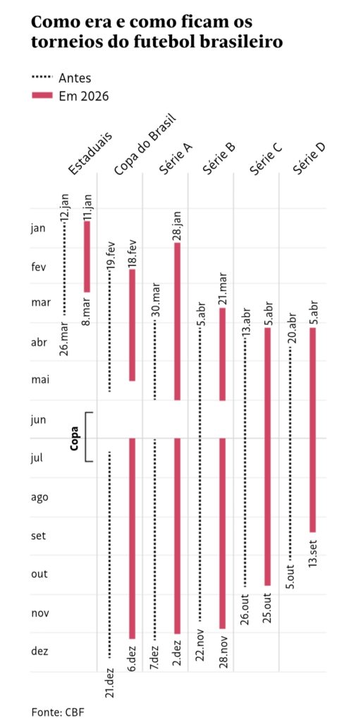 A CBF (Confederação Brasileira de Futebol) anunciou nesta quarta-feira (1º) uma série de mudanças que alteram de maneira importante o calendário do futebol brasileiro para o quadriênio 2026-2029.