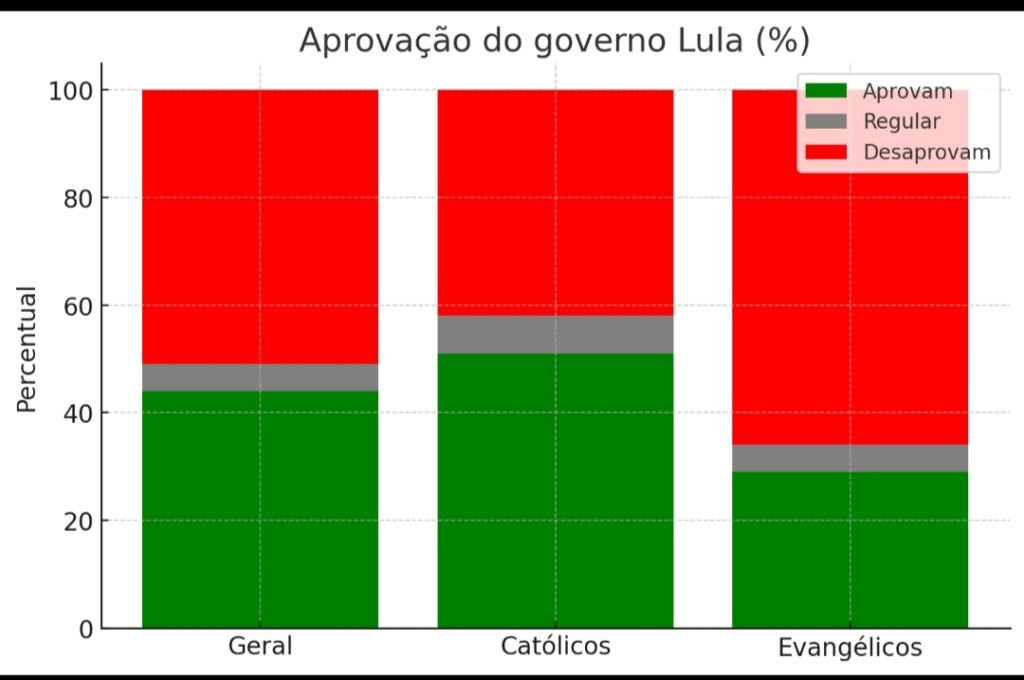 A aprovação geral do governo Lula continua em leve recuperação: atualmente, 44% dos eleitores aprovam a administração, contra 51% que desaprovam. Em julho, os índices eram de 42% e 54%, respectivamente. Entre os católicos, o governo é aprovado por 51% e desaprovado por 42%, retomando a liderança na taxa de aprovação fora da margem de erro desde dezembro de 2024. Entre os evangélicos, o cenário ainda mostra ampla desaprovação, com 66% desaprovando e 29% aprovando a gestão.