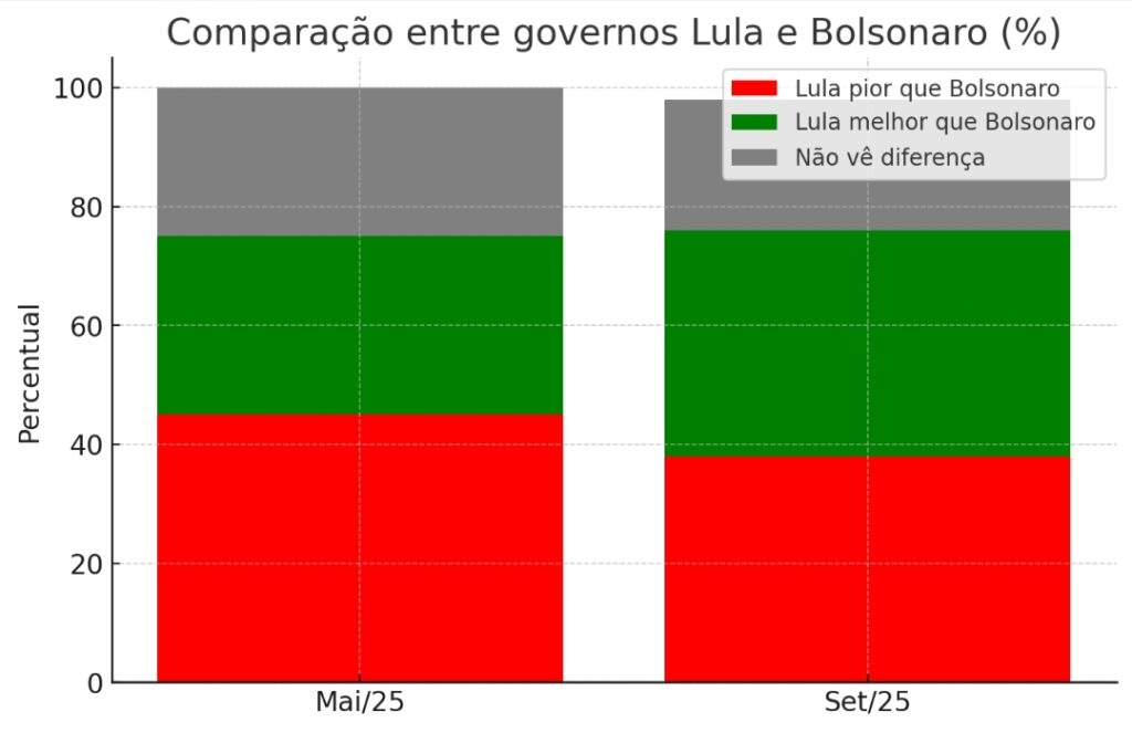 A pesquisa também mostra mudanças na percepção sobre os governos de Lula e Bolsonaro. Em maio, 45% dos eleitores consideravam a gestão de Lula pior que a de seu antecessor, enquanto 30% achavam o governo melhor. Agora, 38% avaliam a gestão petista como pior e 38% como melhor, apontando um empate técnico. Outros 22% afirmam não notar diferenças entre as administrações.