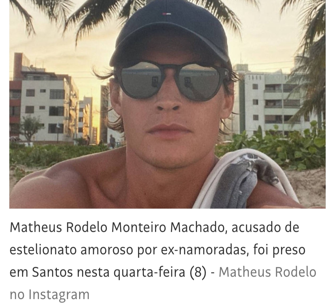 Acusado de estelionato amoroso por ex-namoradas de vários estados, Matheus Rodelo Monteiro Machado, 26, foi preso na noite desta quarta-feira (8) em operação da 1ª Delegacia da Divisão Especializada de Investigações Criminais (Deic) de Santos (SP).