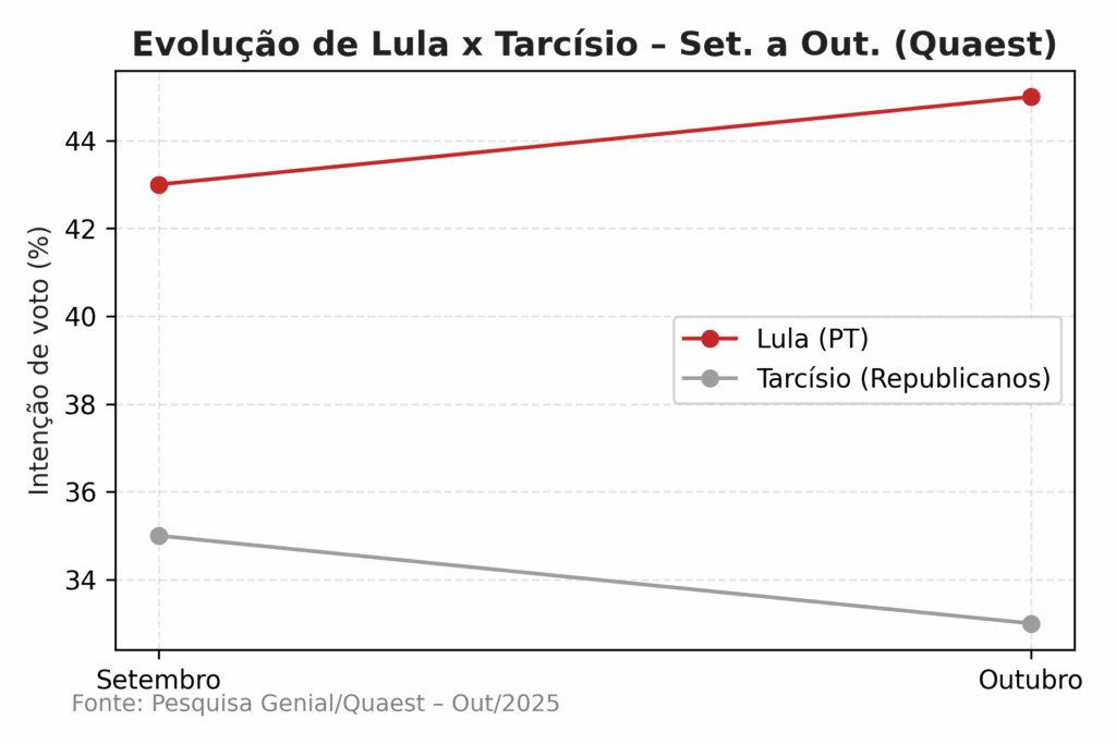 Segundo a Quaest, o desempenho de Lula reflete um cenário de dispersão entre os nomes da direita e centro-direita, sem um candidato consolidado para 2026.