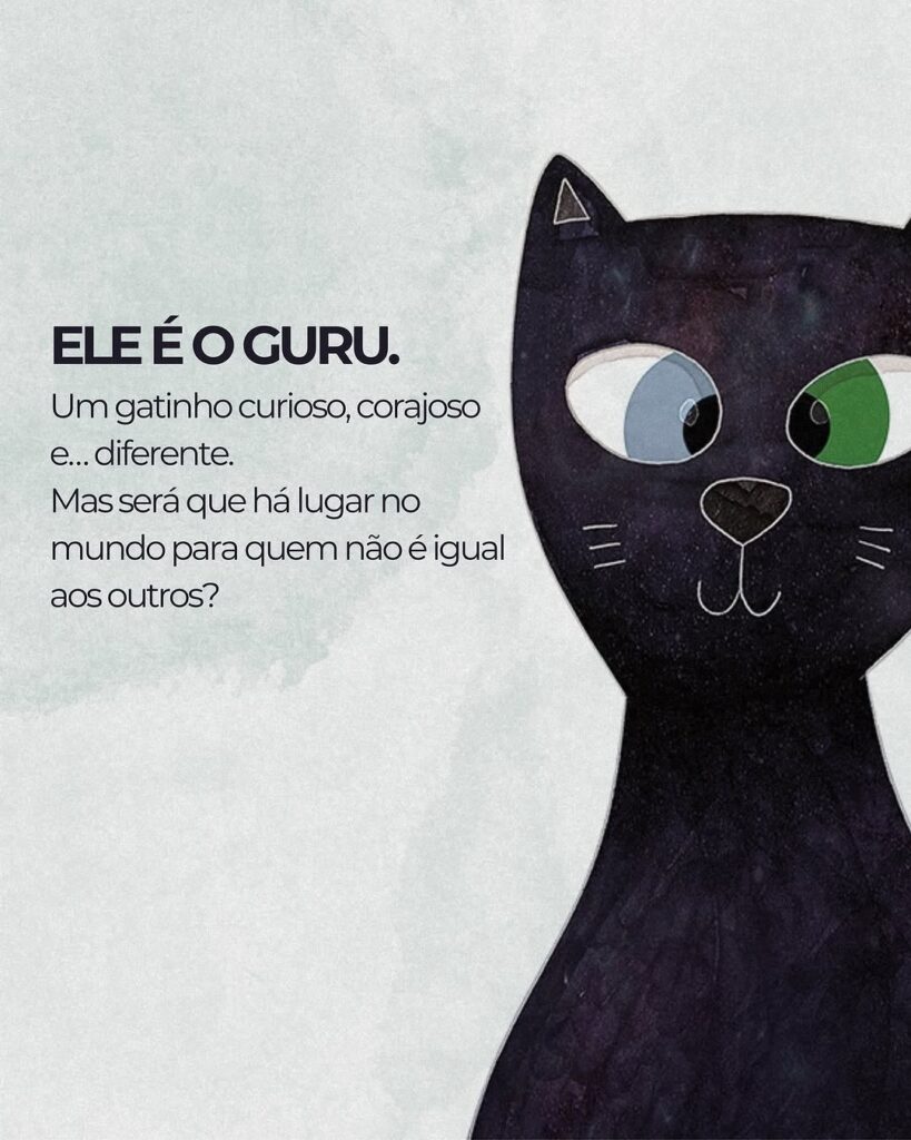 Publicado pela Cora Editora e contemplado pelo edital Ruth Quintela, com recursos da Política Nacional Aldir Blanc (PNAB), o livro traz a história de Guru, um gatinho de olhos diferentes que aprende a compreender o valor da diversidade e da empatia no mundo dos humanos.