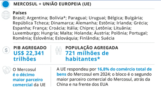 Do lado europeu, são necessárias as aprovações do Conselho da UE, que reúne os 27 países do bloco, e do Parlamento Europeu para a implementação do acordo.