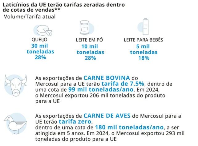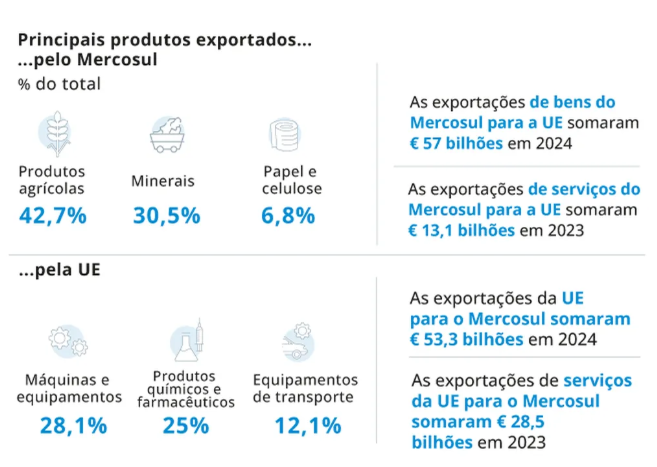 O tratado de livre comércio pretende favorecer as exportações de automóveis, máquinas e vinhos europeus para os países do Mercosul, em troca da facilidade de acesso da carne, açúcar, arroz e soja sul-americanos.