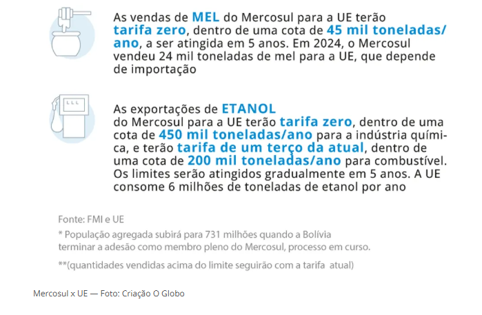 Os agricultores franceses temem que seu mercado seja inundado por produtos agrícolas do Mercosul, considerados mais competitivos, mas a Comissão Europeia prometeu intervir em caso de desestabilização do mercado.