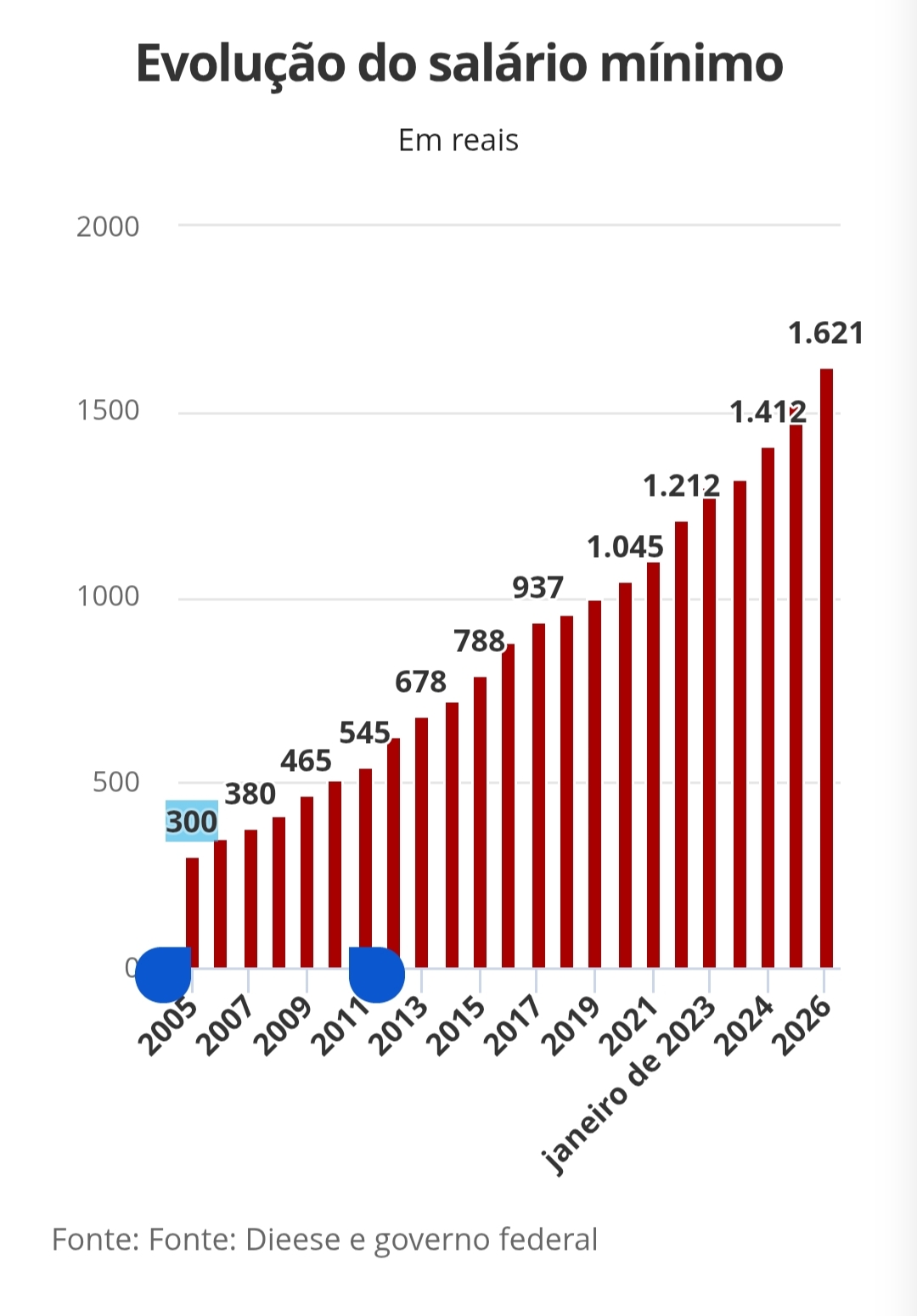 Já no terceiro mandato do presidente Luiz Inácio Lula da Silva, o salário mínimo voltou a ter aumento acima da inflação, com base na política de valorização retomada pelo governo. O cálculo considera a inflação medida pelo Índice Nacional de Preços ao Consumidor (INPC) em 12 meses até novembro, que foi de 4,18%, somada ao crescimento real do Produto Interno Bruto (PIB) de dois anos antes, limitado a 2,5%, conforme as regras do novo arcabouço fiscal.