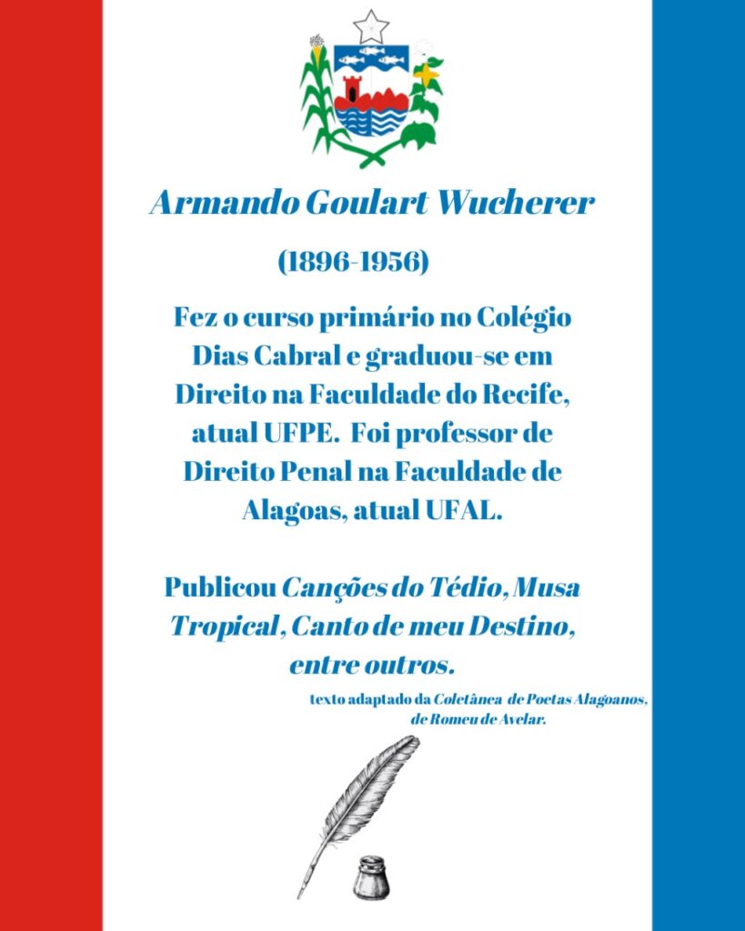 Autor de Canções do Tédio, uma das obras mais singulares da poesia produzida em Alagoas no século XX, Armando Goulart Wucherer (1896–1956) permanece como um nome de referência na vida intelectual e literária do estado. Sua poesia, atravessada pela melancolia, pela introspecção e por um olhar crítico sobre a existência, transformou o tédio em matéria estética e reflexão sensível sobre o tempo humano.