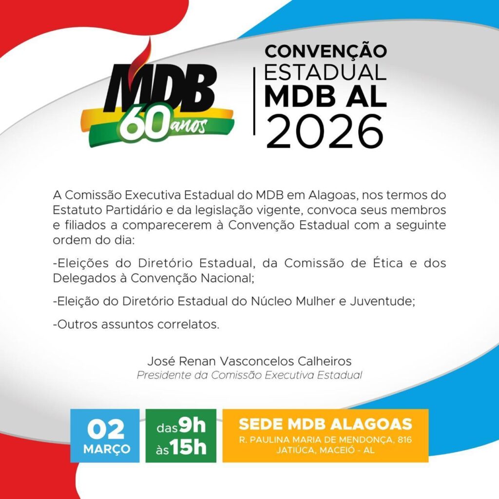 O encontro está marcado para o dia 2 de março, das 9h às 15h, e será realizado na sede do MDB em Alagoas, situada na Rua Paulina Maria de Mendonça, nº 816, no bairro da Jatiúca, em Maceió. A convocação ocorre nos termos do Estatuto Partidário e da legislação eleitoral vigente.