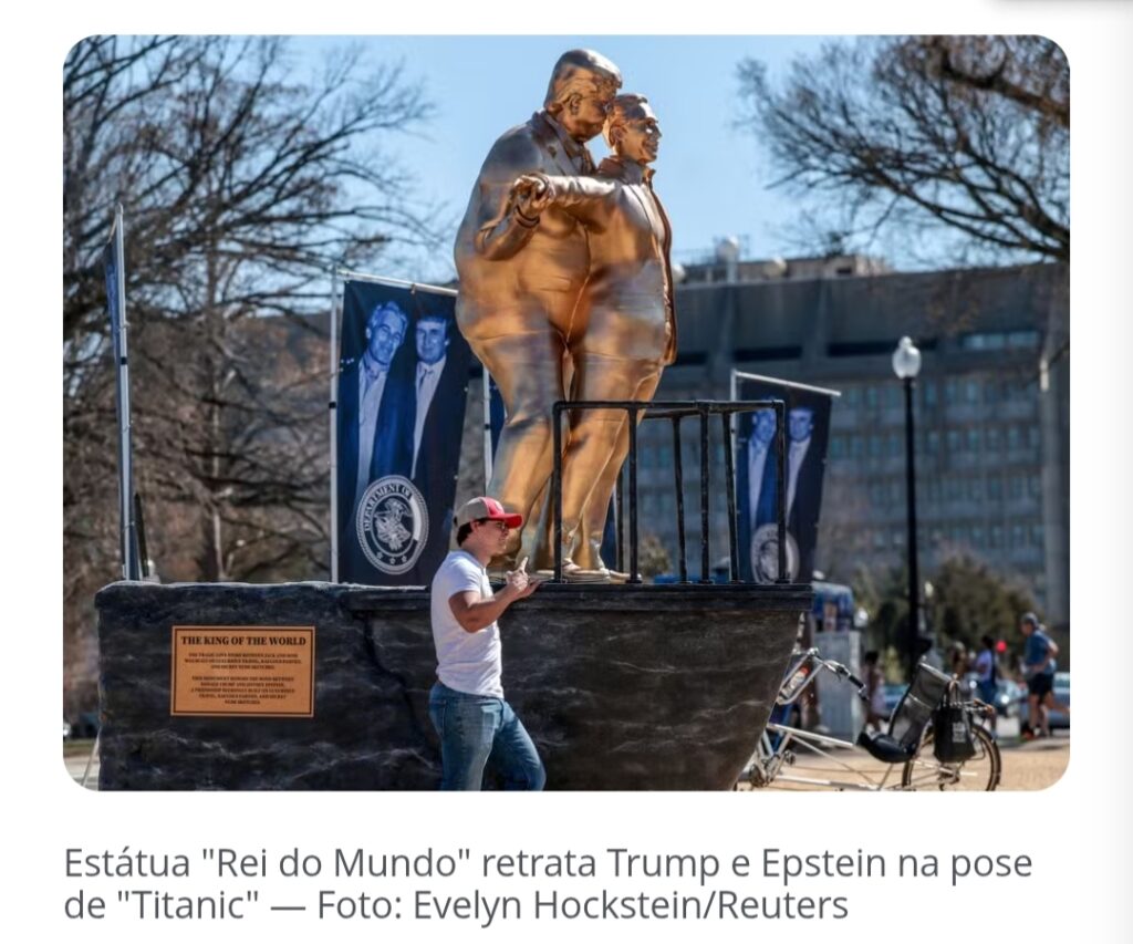 Uma escultura satírica representando o presidente dos Estados Unidos, Donald Trump, e o financista condenado por crimes sexuais Jeffrey Epstein foi instalada nesta terça-feira (10) no National Mall, área próxima ao Capitólio dos Estados Unidos, em Washington. A obra recria uma das cenas mais conhecidas do filme Titanic e chamou a atenção de visitantes que circulavam pelo local.