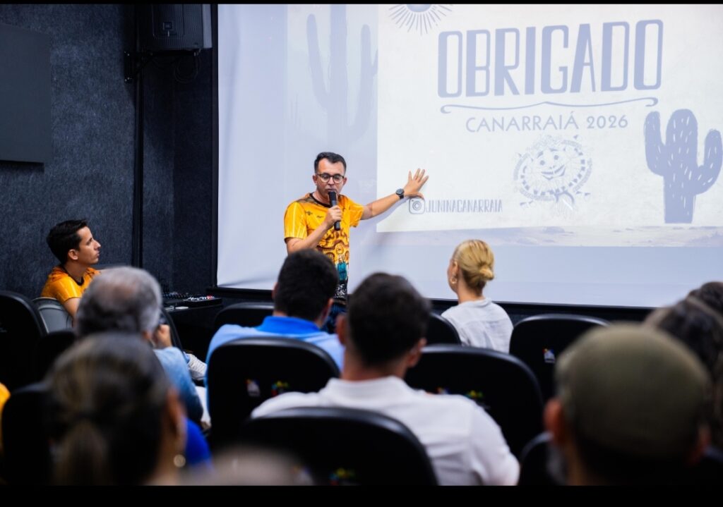 A Junina Canarraiá apresentou, na noite de sexta-feira (13), na sala de cinema da Associação dos Moradores da Canafístula, o projeto e o tema da temporada 2026. O evento reuniu autoridades, patrocinadores, produtores culturais e membros da comunidade, com o objetivo de garantir apoio financeiro para a manutenção das duas quadrilhas do grupo: a Canarraiá e a Canarraiá Kids.